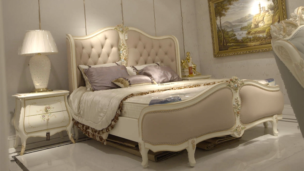 This elegant classic bed offers a refined blend of comfort and artistry. The high tufted headboard provides a plush, luxurious look, while the soft cream and beige tones create a warm, serene atmosphere. Intricate floral accents along the frame add a touch of vintage charm, making it a standout piece in any bedroom.