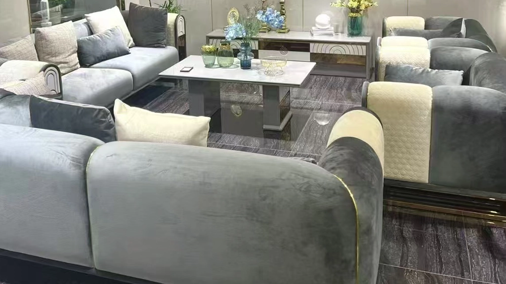 This modern luxury sofa set delivers a perfect blend of comfort and refined style. The soft grey upholstery provides a smooth, inviting feel, while the structured cushions ensure balanced support for everyday use. Gold-accent details along the edges add a subtle upscale touch, elevating the overall look of the room.
