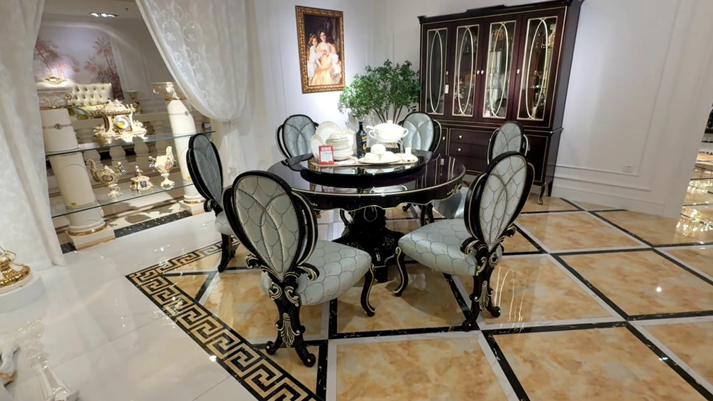 The Majesty Royale Dining Table Set is a masterpiece of classical luxury, designed to transform any dining space into a regal experience. Featuring a round black lacquered table with exquisite gold accents, this set radiates sophistication and timeless charm. Six upholstered chairs, adorned with a light blue quilted pattern and ornate black‑and‑gold frames, provide both comfort and grandeur. Perfect for family gatherings, formal dinners, or showcasing refined taste, the Majesty Royale combines durability with artistry. Its elegant craftsmanship and opulent design make it not just furniture, but a statement piece that elevates your home into a palace of style.
