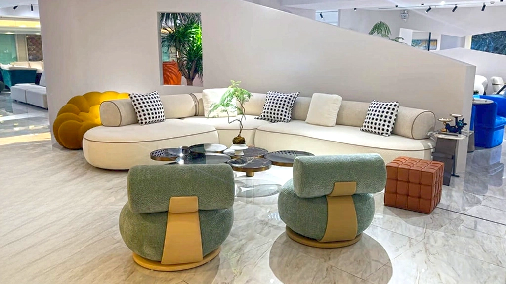 Set against polished marble flooring and a minimalist backdrop, this ensemble blends texture, geometry, and color to create a cohesive and inviting atmosphere. Ideal for upscale homes, boutique lounges, or showroom displays, the Zena set speaks to those who value comfort without compromising on design.